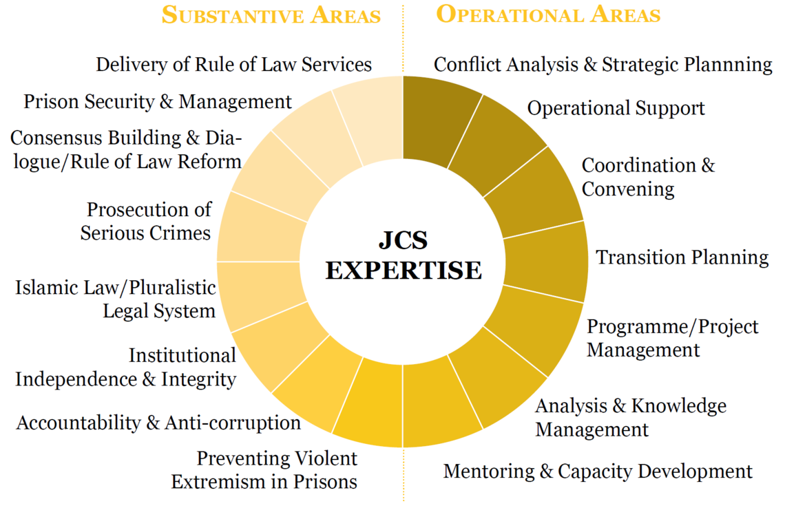 Through its rapid response team – Justice and Corrections Standing Capacity in Brindisi, Italy, JCS provides field-based advice and specialized expertise to field missions and other field presences. Established in 2010, JCSC assists United Nations peace operations and other field presences by means of three core functions: Starting up Justice and Corrections components; Reinforcing existing peace operations and presences in the areas of justice and corrections by providing time-limited and targeted support; and Conducting needs assessments and reviews in the areas of justice and corrections.