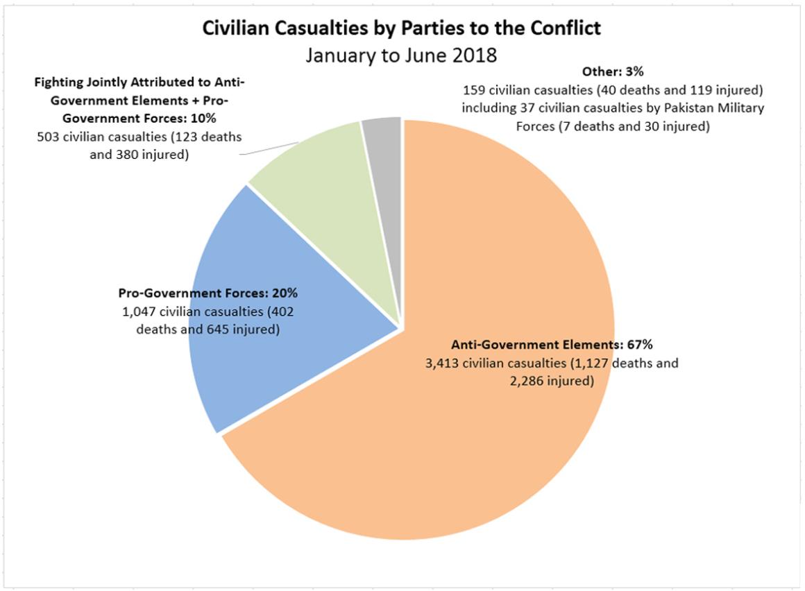 UNAMA attributed 1,047 civilian casualties to Pro-Government Forces, approximately the same as during the corresponding period in 2017. Pro-Government Forces caused 20 per cent of all civilian casualties in the first half of 2018 (17 per cent by Afghan national security forces, two per cent by international military forces, and one per cent by pro-Government armed groups).