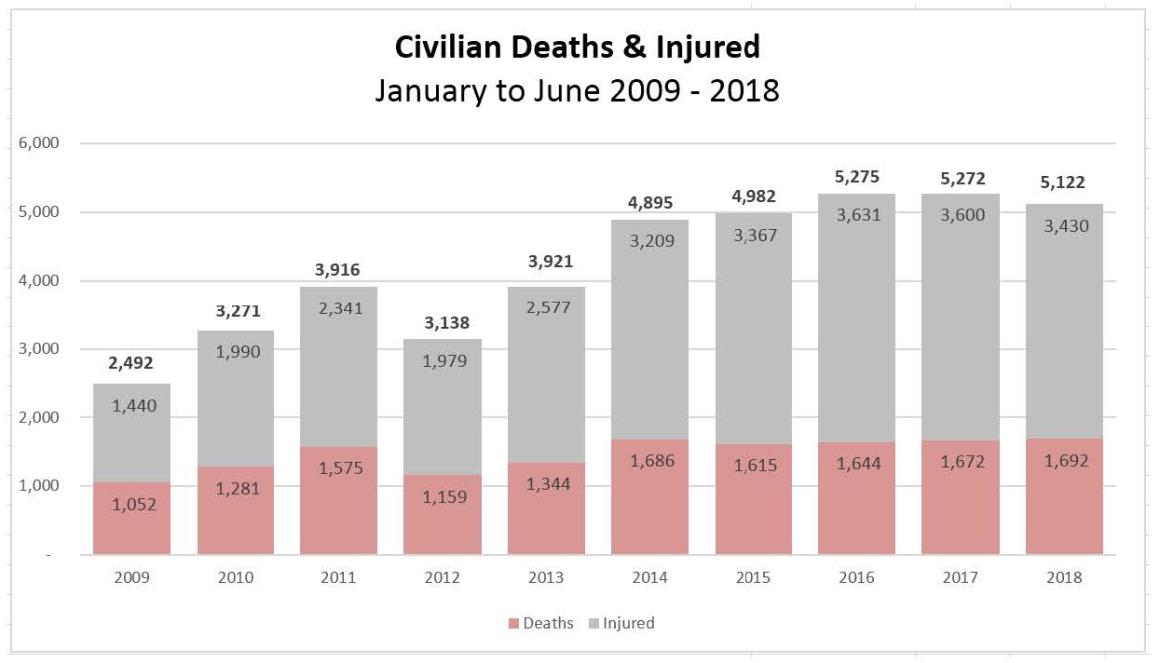 KABUL - Latest figures released today by the UN Assistance Mission in Afghanistan (UNAMA) show continuing record high casualty rates being inflicted on the Afghan civilian population by the warring parties. Covering the period 1 January to 30 June 2018, findings include the killing of more civilians in the first six months of this year – 1,692 deaths – than at any comparable time over the last ten years since records have been kept.