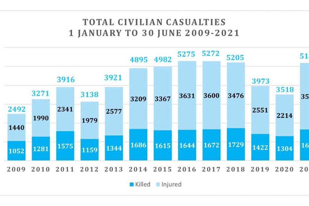 KABUL - Civilian casualties in Afghanistan in the first half of 2021 reached record levels, including a particularly sharp increase in killings and injuries since May when international military forces began their withdrawal…