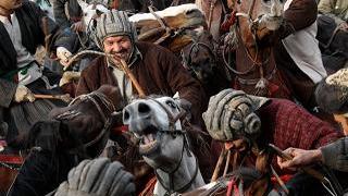 To the sound of live Afghan music and the cheering crowd, players whip their horses and gallop their way to the carcass of a calf. Holding it by a stirrup, in the midst of battle, the tchopendozs attempt to lift it from the earth before rushing to the flag pole and the goal. All along the way, they must bypass other players, trying to seize the precious trophy from them.