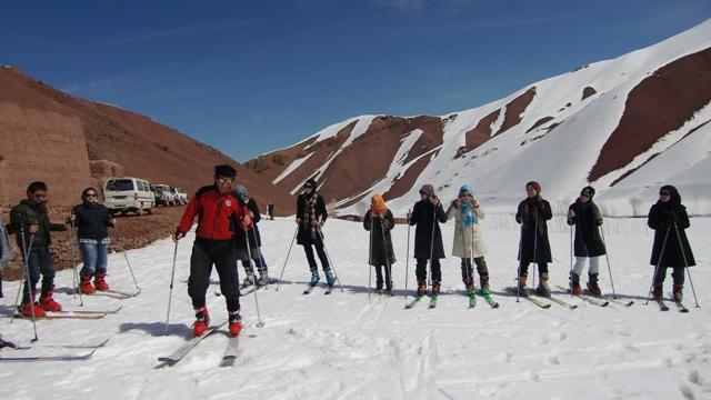 Altogether 12 women joined the ski event, which was held at Khushkag Valley, about 12 kilometers outside the provincial capital of Bamyan. The lesson was organized through a collaboration between the Aga Khan Foundation (AKF) and the UNAMA Human Rights Unit (HRU). The instruction was provided by Ferdinando ‘Nando’ Rollando, an Italian who started training Bamyanis to glide on their snowy slopes in January.