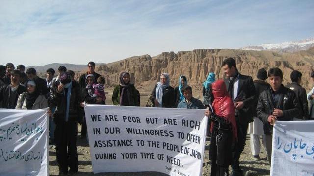 A group of Bamyan youth gathered Monday with a banner stating, “We are poor but are rich in our willingness to offer assistance to the people of Japan during your time of need.”