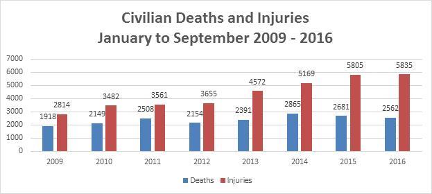 UNAMA documented 1,897 civilian casualties (623 deaths and 1,274 injured) caused by Pro-Government Forces in the first nine months of 2016, a 42 per cent increase compared to the same period in 2015. The majority of civilian casualties caused by Pro-Government Forces occurred in the context of ground fighting with Anti-Government Elements.