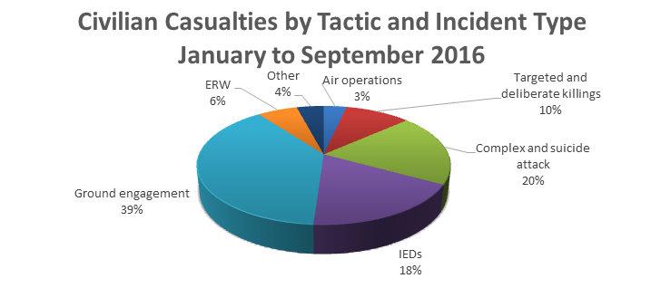 Between 1 January and 30 September, UNAMA documented 8,397 conflict-related civilian casualties (2,562 deaths and 5,835 injured) representing a one per cent decrease compared to the same period in 2015. Ground engagements remained the leading cause of civilian casualties, followed by suicide and complex attacks, and improvised explosive devices (IEDs).