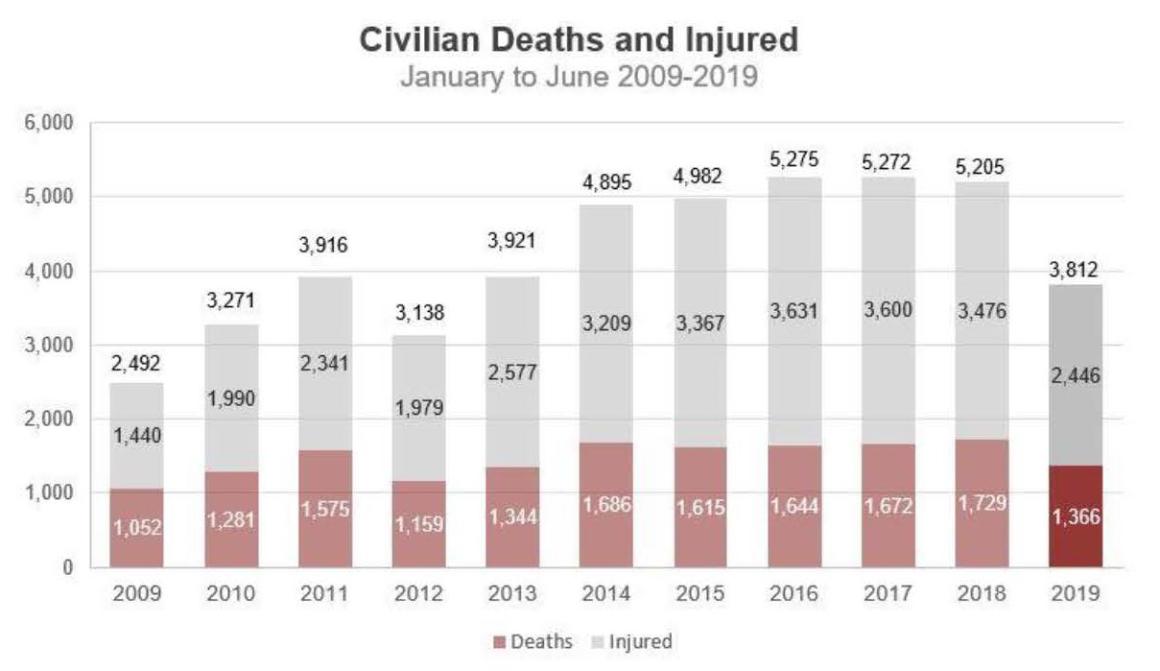 While the number of civilians killed and injured is 27 per cent down from the same period in 2018 –the year that saw record high numbers of recorded civilian casualties– the UN notes with concern disturbing patterns such as the 27 per cent increase in civilian deaths in the second quarter of 2019 compared with the first.