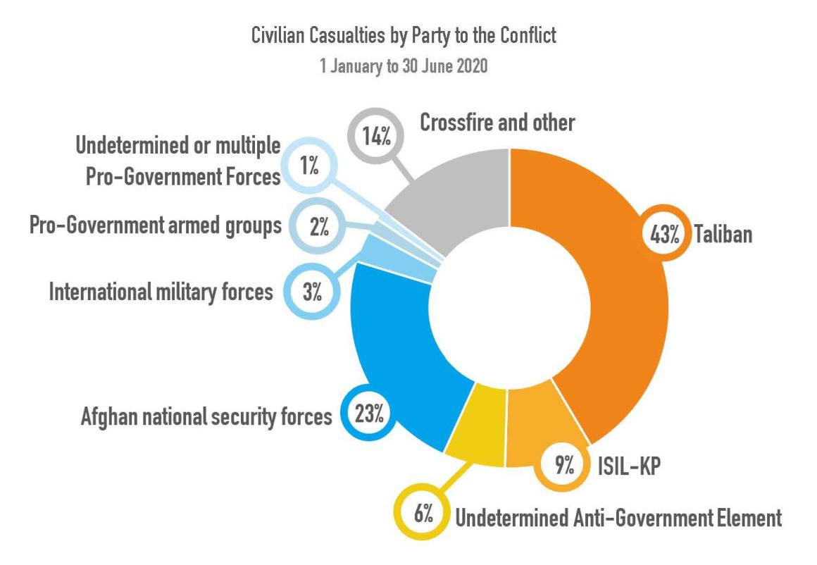 While the civilian casualty figures represent a 13 per cent decrease as compared to the first six months of 2019, Afghanistan remains one of the deadliest conflicts in the world for civilians. But it must be noted that there has been no reduction in civilian casualties caused by the Taliban and Afghan national security forces. The main reason for the lower number of civilian casualties is due to a reduction in operations by international military forces and the Islamic State of Iraq and the Levant–Khorasan Province, according to the report issued by the UN Assistance Mission in Afghanistan (UNAMA).