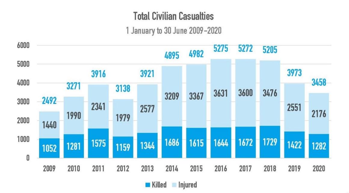 KABUL - The first half of 2020 witnessed fluctuating levels of violence impacting civilians in Afghanistan, with the United Nations documenting 3,458 civilian casualties (1,282 killed and 2,176 injured), according to a new report released today.