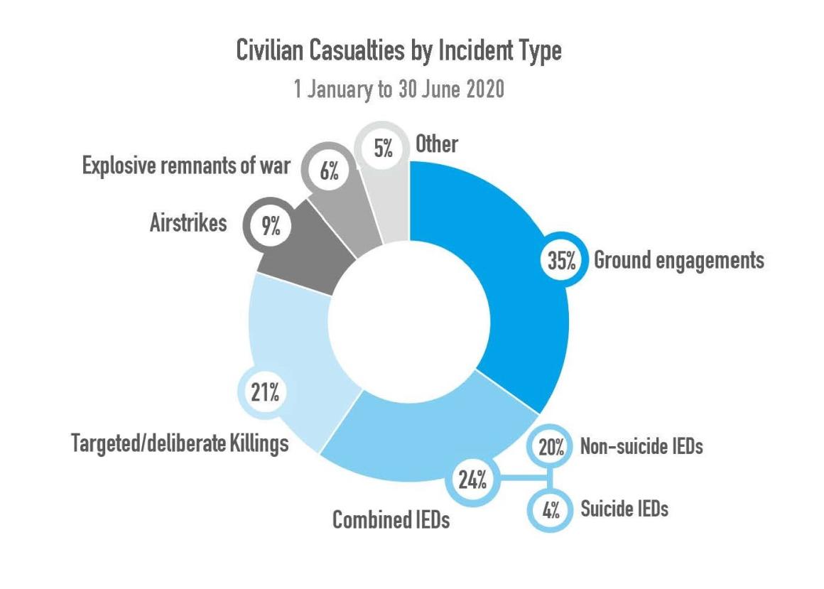 Ground engagements remained the leading cause of civilian casualties with the majority – two-thirds – caused by the use of indirect fire, particularly in civilian-populated areas. The use of improvised explosive devices (suicide and non-suicide) was the second leading cause of civilian casualties, followed by targeted killings. UNAMA is especially concerned about the deliberate targeting of civilians, including religious leaders, healthcare workers, members of the judiciary, civil society activists, non-governmental organization workers and journalists.