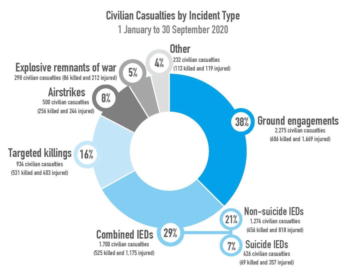 Ground engagements, mainly between the Taliban and the Afghan national security forces, caused the most civilian casualties, responsible for more than one third of all civilian casualties. This was followed by suicide and non-suicide IEDs (29 per cent), targeted killings (16 per cent) and airstrikes (eight per cent).
