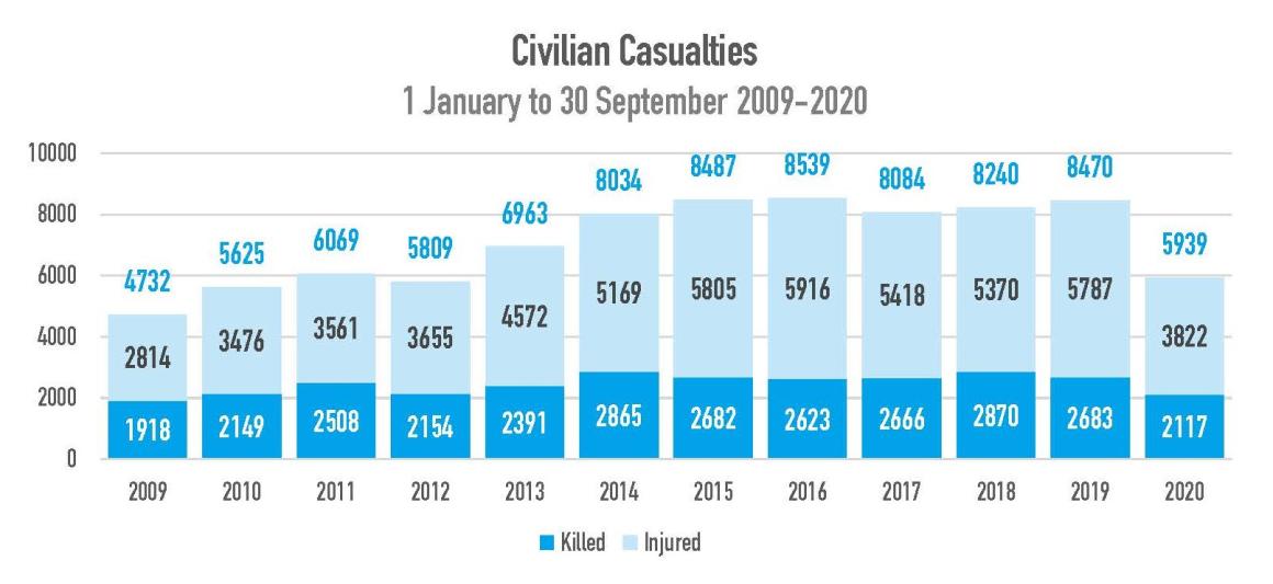 The Mission’s latest quarterly report documented 5,939 civilian casualties (2,117 killed and 3,822 injured) from 1 January to 30 September 2020. High levels of violence continue with a devastating impact on civilians, with Afghanistan remaining among the deadliest places in the world to be a civilian.