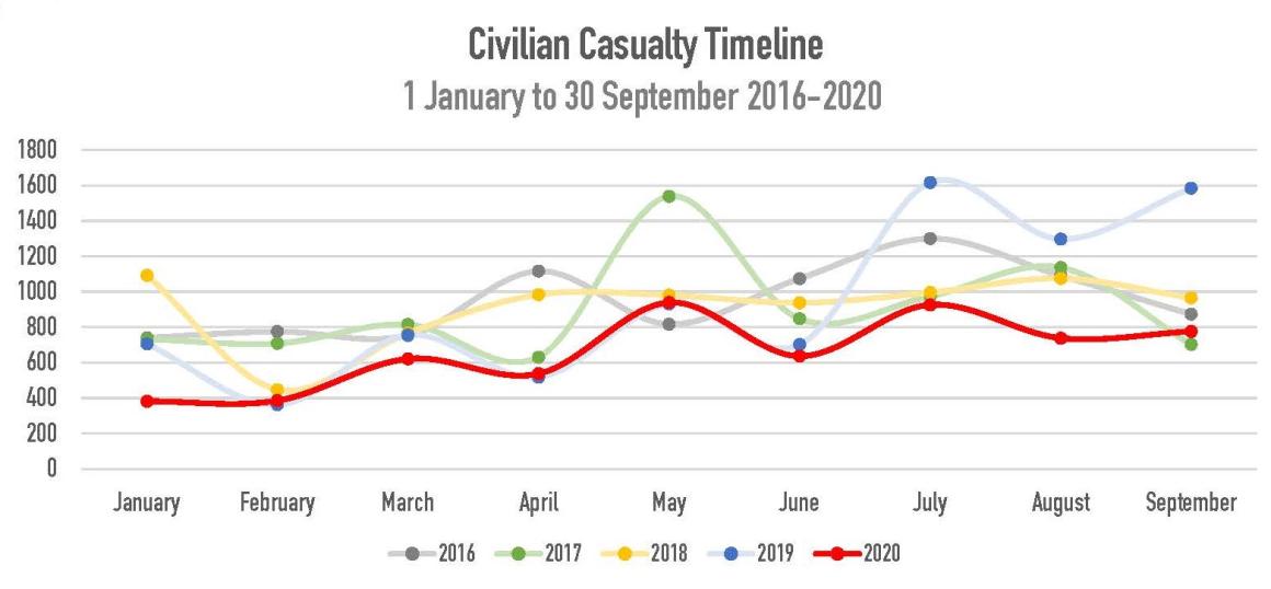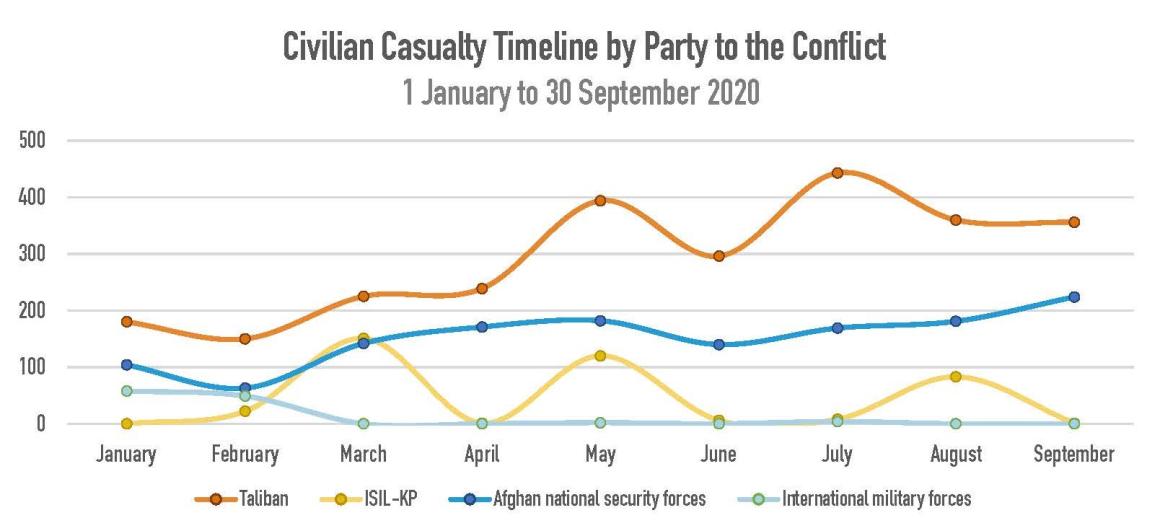 The Mission notes with concern that in the period from 12 September – the start of the Afghanistan peace negotiations between the Government of the Islamic Republic of Afghanistan and the Taliban in Doha, Qatar – to 30 September, there was no reduction in the documented number of civilian casualties caused by parties involved in the talks in comparison to previous weeks.
