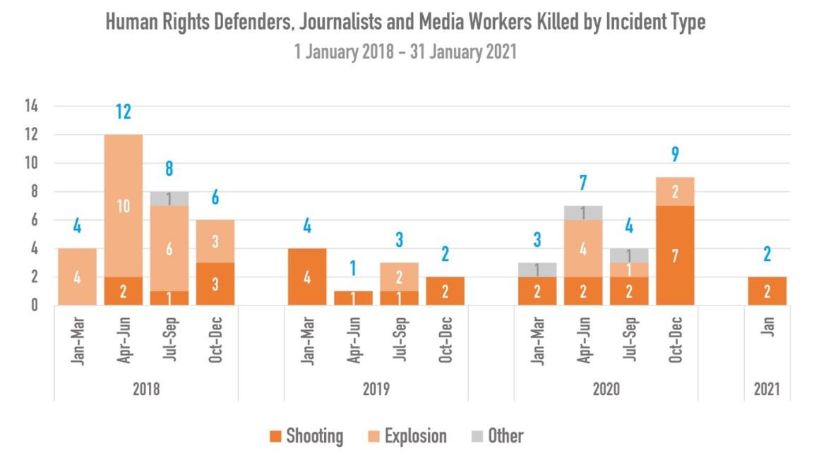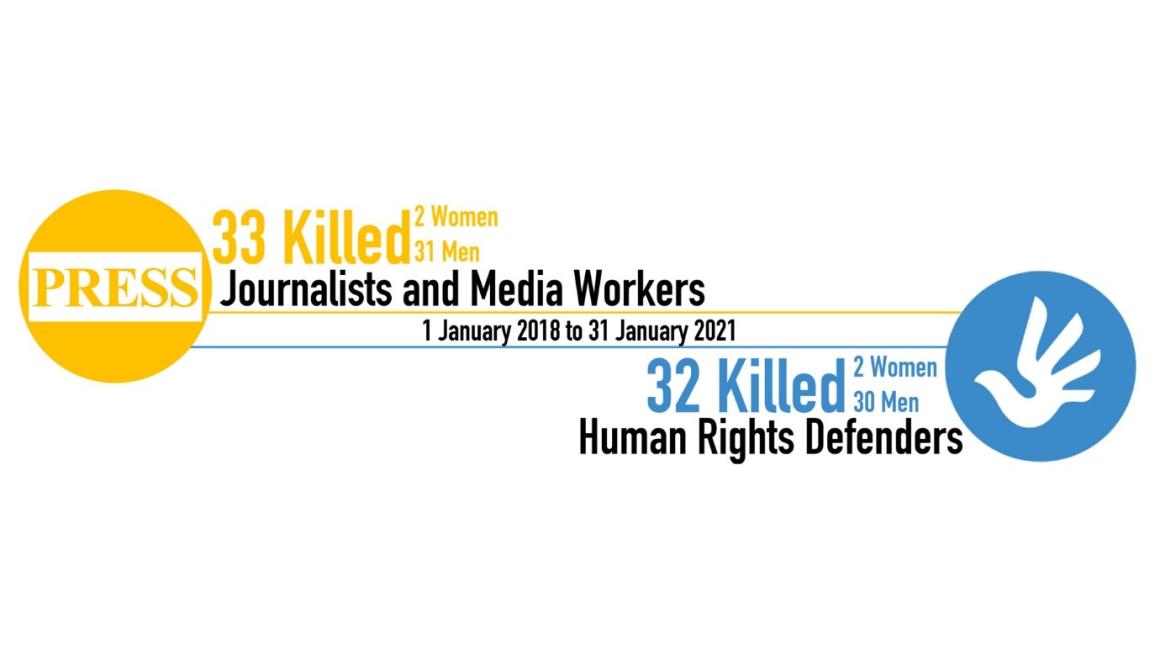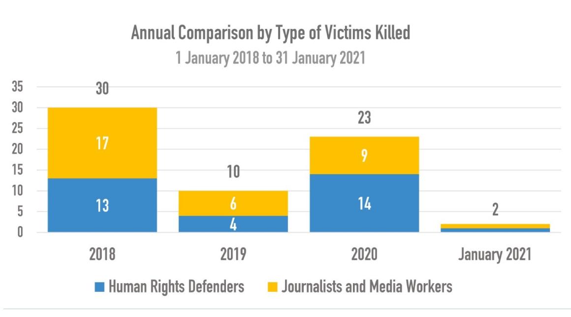 The report records a total of 65 human rights defenders and media professionals killed in the period from 1 January 2018 – 31 January 2021, 32 from the human rights sector and 33 from the media. Of these, 11 (five human rights defenders and six media) were killed in the four-month period from 1 October 2020 – 31 January 2021 alone.