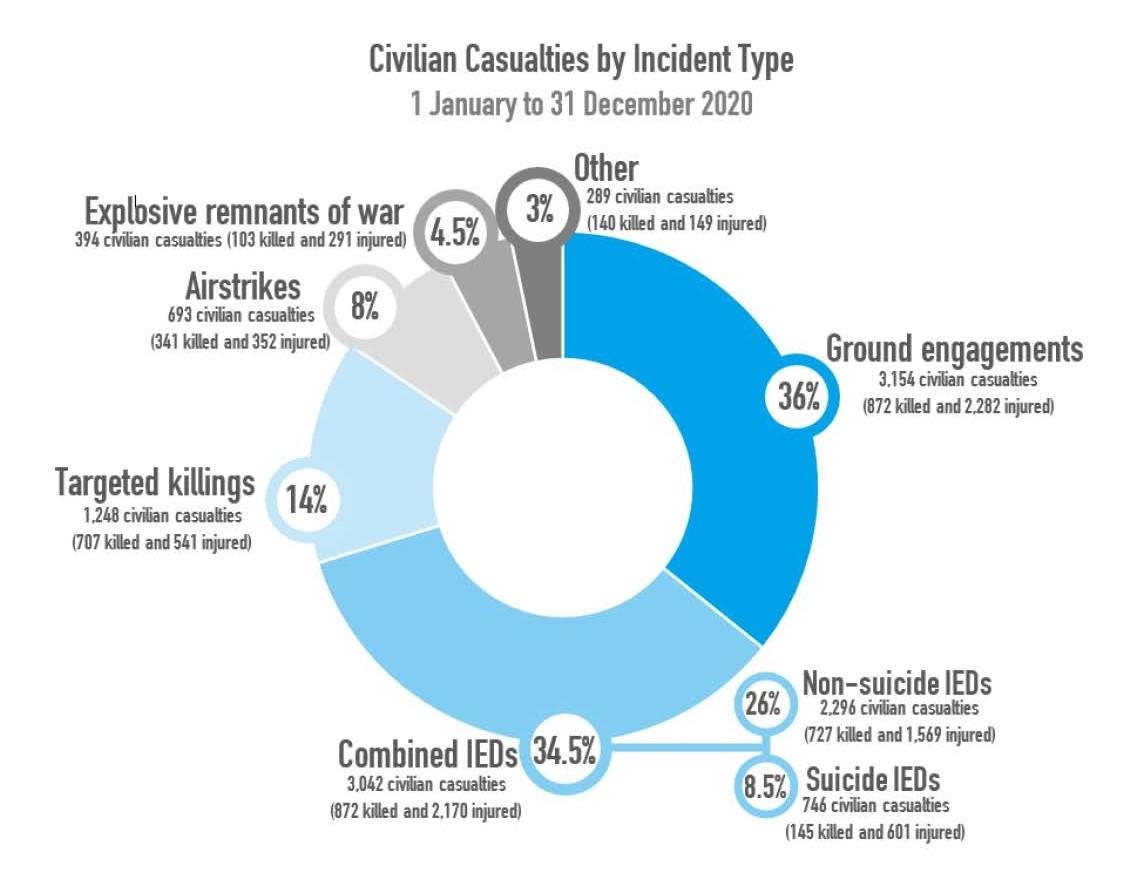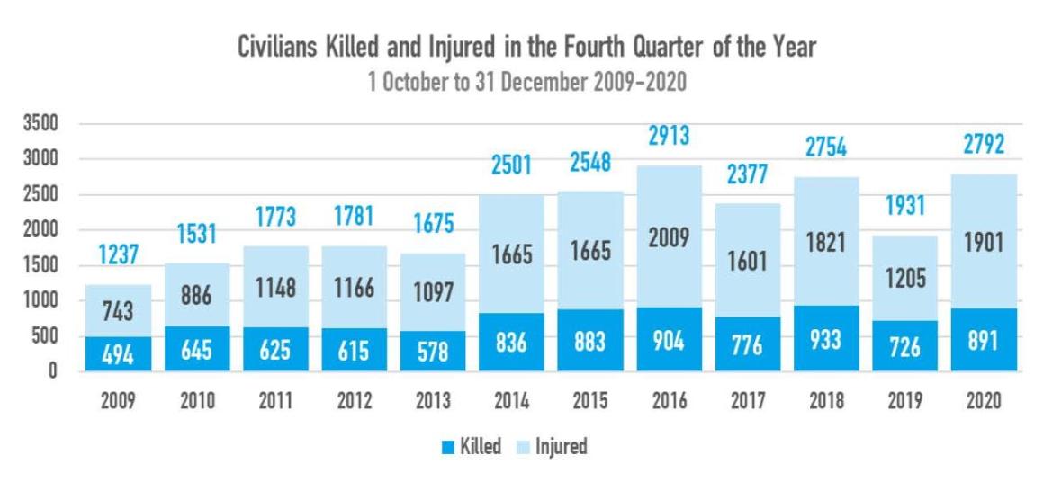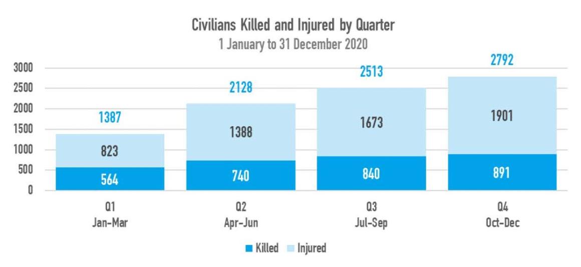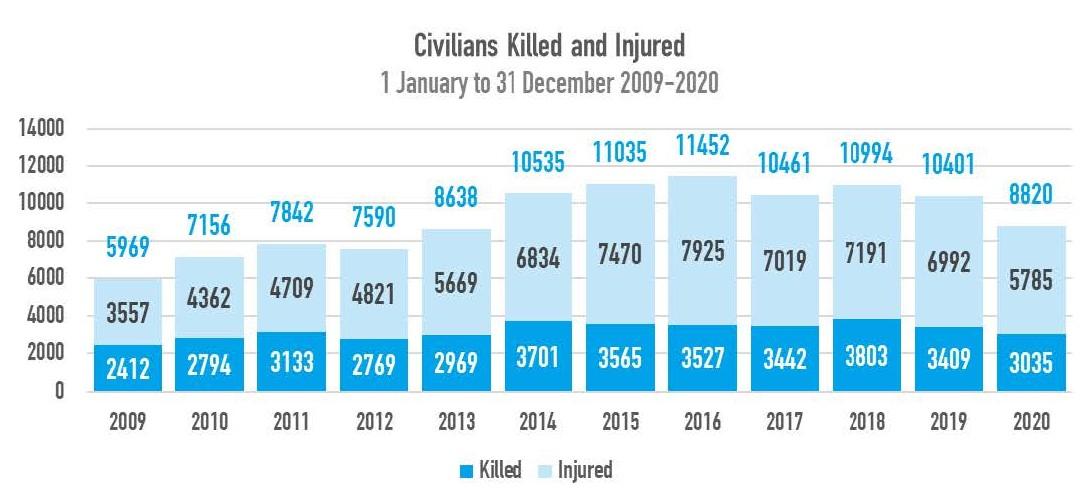 The overall number of civilian casualties in 2020 of 8,820 (3,035 killed and 5,785 injured) fell below 10,000 for the first time since 2013 and was 15 per cent down on 2019. While the reduced numbers are welcome, documentation shows that the lower levels of overall harm were partially offset by increases from certain tactics, as well as from an uncharacteristic increase in civilian harm in the last quarter of the year.