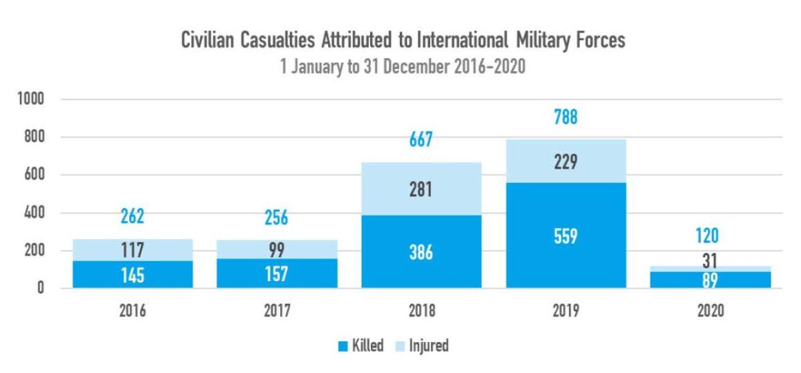 Strikingly, international military forces in 2020 were responsible for their lowest recorded number of civilian casualties since UNAMA began documentation in 2009. In 2020, this figure was 120 civilian casualties, down from 786 in 2019, a decrease of 85 per cent.