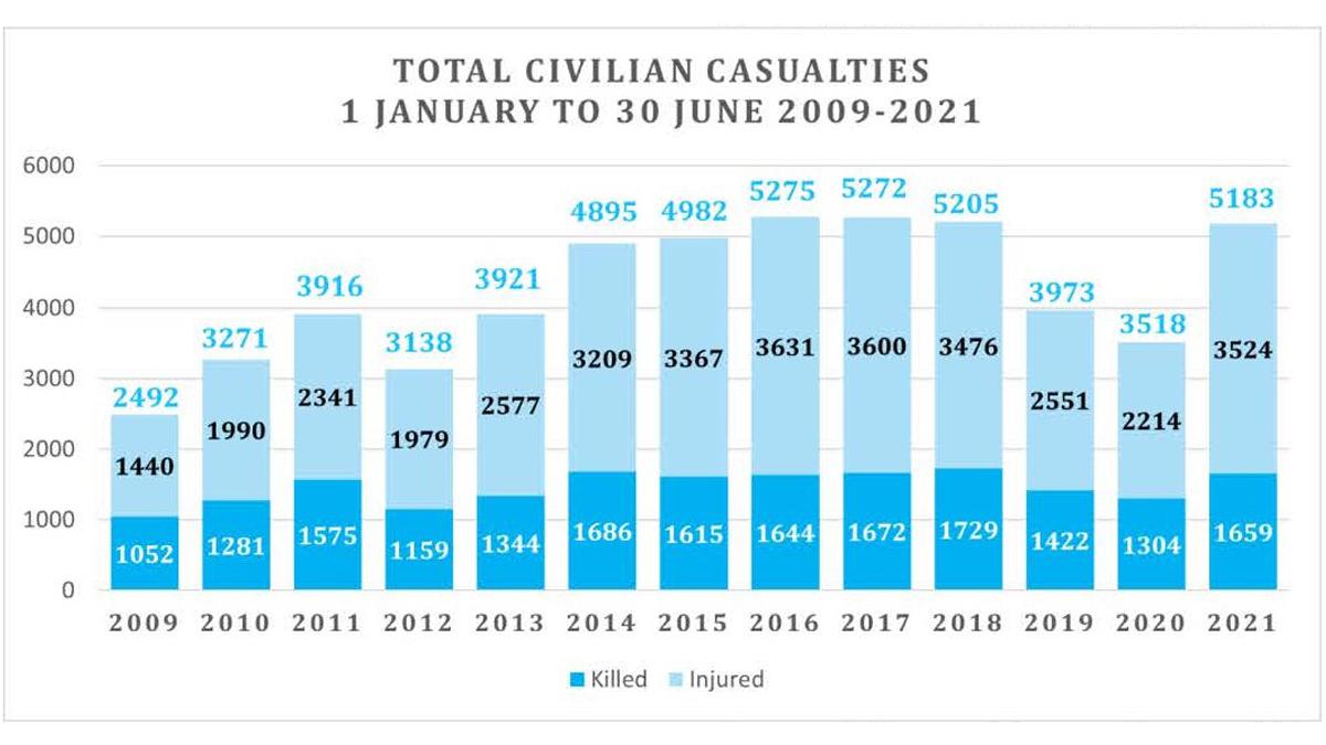 UNAMA’s Afghanistan Protection of Civilians in Armed Conflict Midyear Update 2021 documents 5,183 civilian casualties (1,659 killed and 3,524 injured), a 47 per cent increase compared with the same period in 2020.