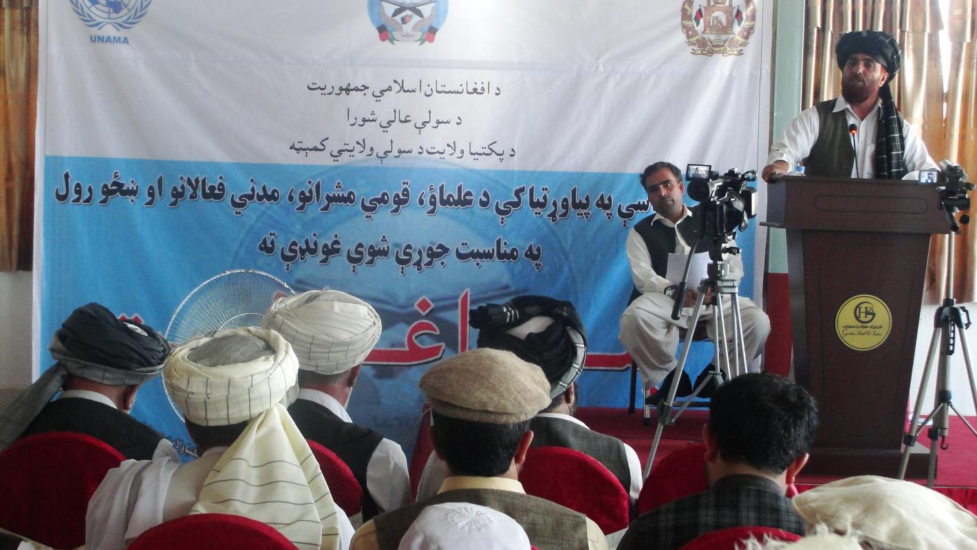Around 100 people, including community elders, religious scholars, representatives of civil society, members of the Provincial Council, government officials and journalists attended the meeting in the capital city of Afghanistan’s southeastern province of Paktya. It is part of a series of three meetings, with one already held in Khost province and the final scheduled for Paktika province tomorrow.