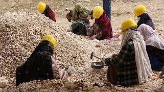 Sitting around a huge heap of stones, 20 women wearing Iranian-style veils and helmets are patiently gravelling those stones with small hammers.